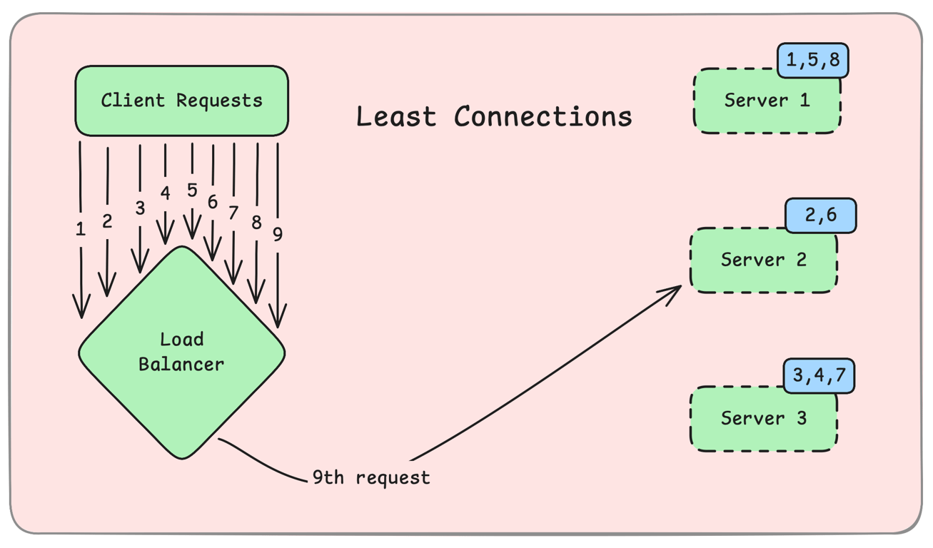 Server B (2 active connections) ← Next request goes here